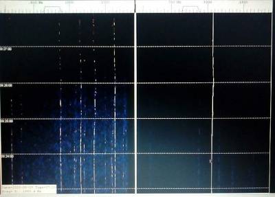 Esta foto es una instantánea de una serie de capturas realizas a lo largo de toda la noche. Nuestro radiotelescopio utiliza dos receptores SDR-RTL con los osciladores sincronizados. Obtenemos así dos señales independientes, pero sincronizadas, que enviamos a cada uno de los canales de audio -L y R- de la tarjeta de sonido del PC. Luego, el software SpectrumLab procesa y registra ambas señales trabajando en modo estereofónico.