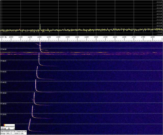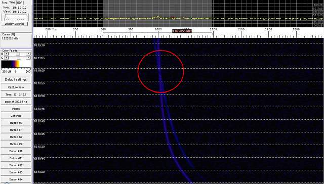 A pesar del bajo nivel de la señal transmitida, podemos apreciar perfectamente en el waterfall los ecos de la misma sobre aviones, separada unos hertzios de la señal principal y con el característico efecto doppler.