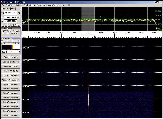 Aunque la señal era muy débil, la distinguimos perfectamente por su “huella” característica cuando se auto-identifica en CW cada 6 minutos. Atención a los ajustes de programa HDSDR que puedes ver en la imagen, con otros ajustes la señal no es detectable entre el ruido de fondo.