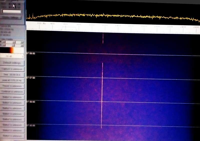 En el siguinete espectrograma vemos una señal clara cuyo nivel ronda los 6-8 dB sobre el ruido de fondo. En el waterfall se aprecia como la señal se interrumpe ocasionalmente. O eso parece…