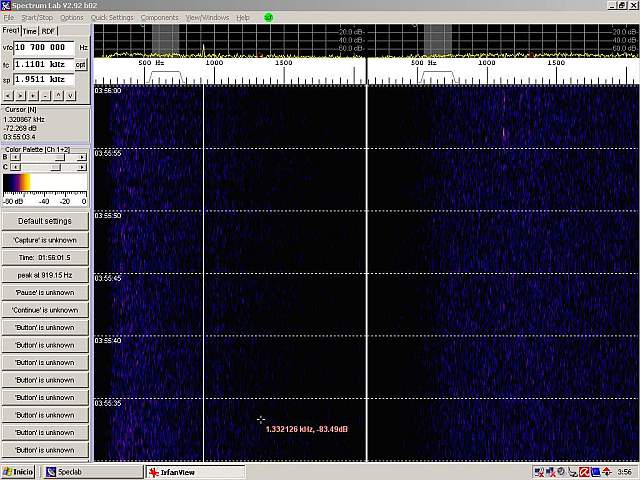 En el canal izquierdo, sobre los 925 Hz, apreciamos una linea blanca vertical. Es la señal generada por ALEXANDRA. La estabilidad es muy buena y se mantiene desde la ultima mejora en el oscilador del transmisor.