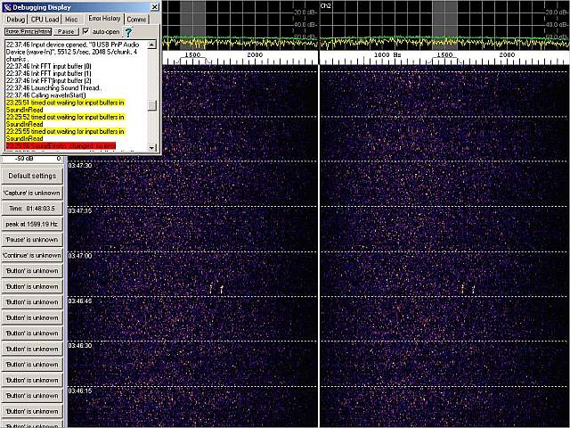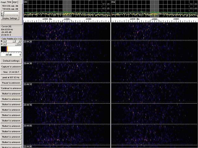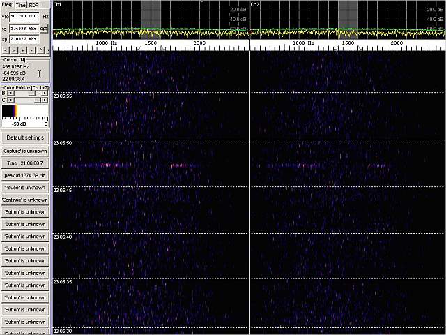 En esta captura, en la parte inferior del waterfall, aparece una débil señal en ambo canales, con un doppler acusado, por eso es casi horizontal. Bueno, mas que una señal, parecen vestigios de la misma ;-). se aprecia mejor en el canal izquierdo.