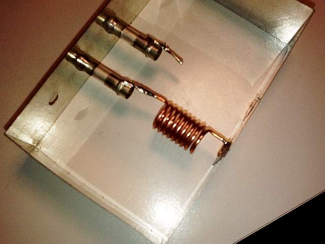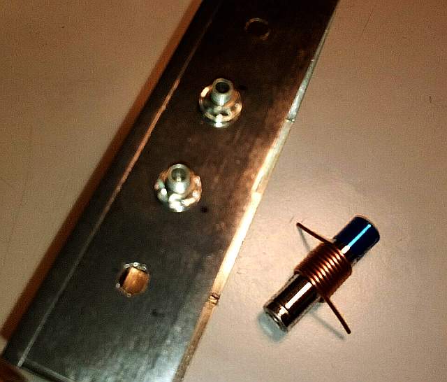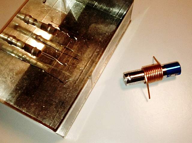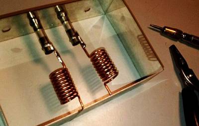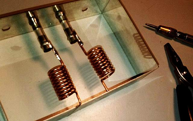 Realizamos unos agujeritos en la caja para ubicar los capacitores ajustables y construimos las bobinas, con nueve vueltas de hilo de cobre de 1,2 mm sobre una pila tamaño AAA.