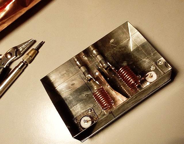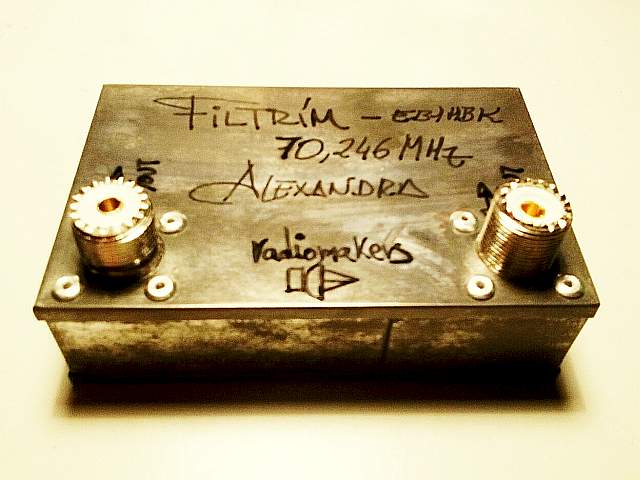Cumplimos ahora con una asignatura pendiente: elaborar un filtro de RX ajustado a la frecuencia nominal de Alexandra, 70,246 MHz. En esta imagen vemos el proto terminado y listo para probarlo. Las siguientes ilustran el proceso de elaboración del Filtrim (¿acrónimo de filtro trimable?).