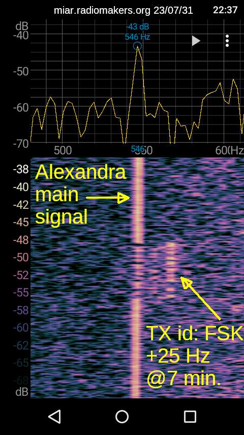 Señal de Alexandra: 70,246 MHz. TX ID FSK +25 HZ @ 7 minutos (locator IN52TQ)