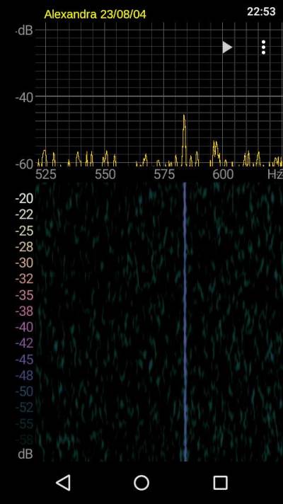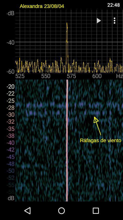 Apagamos el preamplificador y estudiamos la evolucion de la señal conforme avanza la noche, solo con la antena. En cada imagen, arriba a la derecha, aparece la hora de la captura (hora local EA, no UTC) con el smartphone.