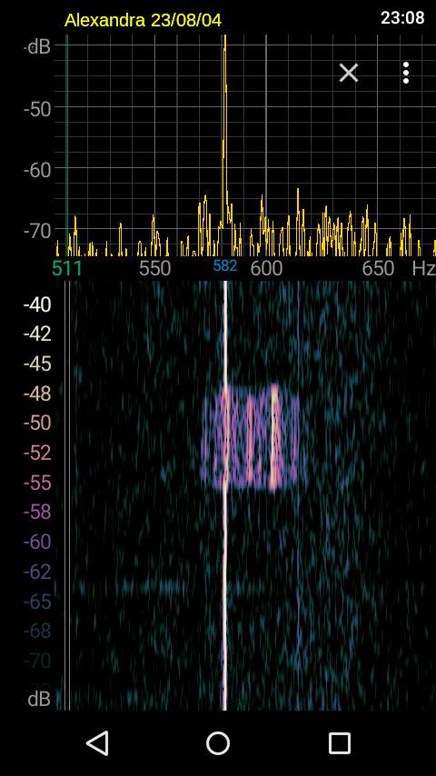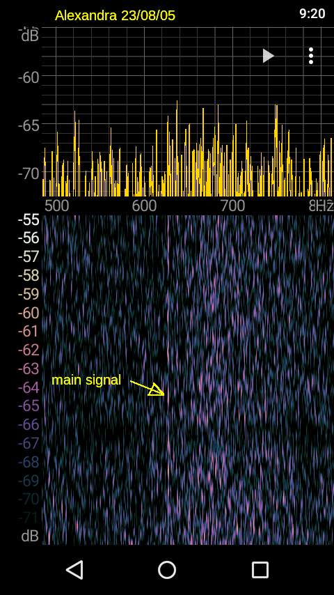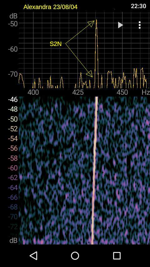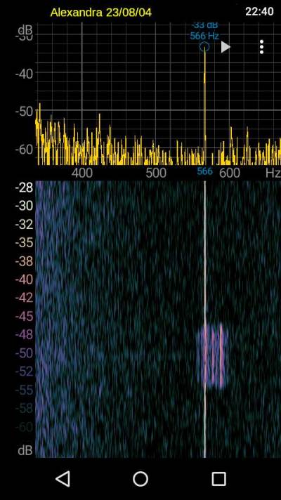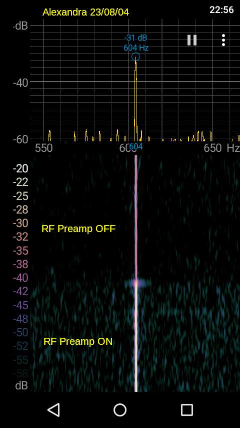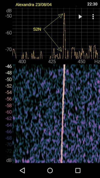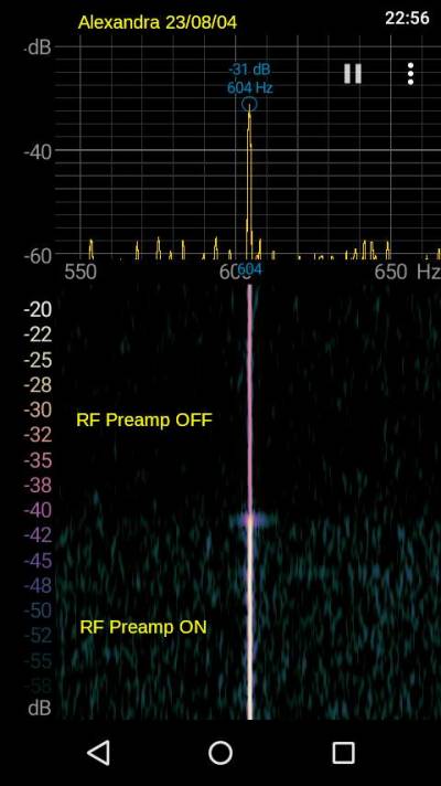 En la foto superior monitorizamos Alexandra directamente desde la antena, sin el filtro. Atencion al nivel de ruido y al nivel de la señal sobre el umbral de ruido (unos 14 dB). Las intermodulaciones de transmisores de radiodifusion cercanos resultan perfectamente audibles en el altavoz.