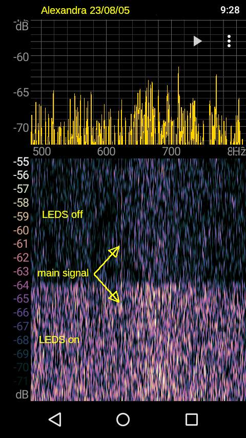 Y ya para terminar, en la siguiente captura se aprecia lo que ocurre con el umbral de ruido, y la recepción de la señal, cuando en casa, o un vecino, enciende una eficiente luz LED…