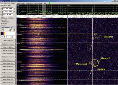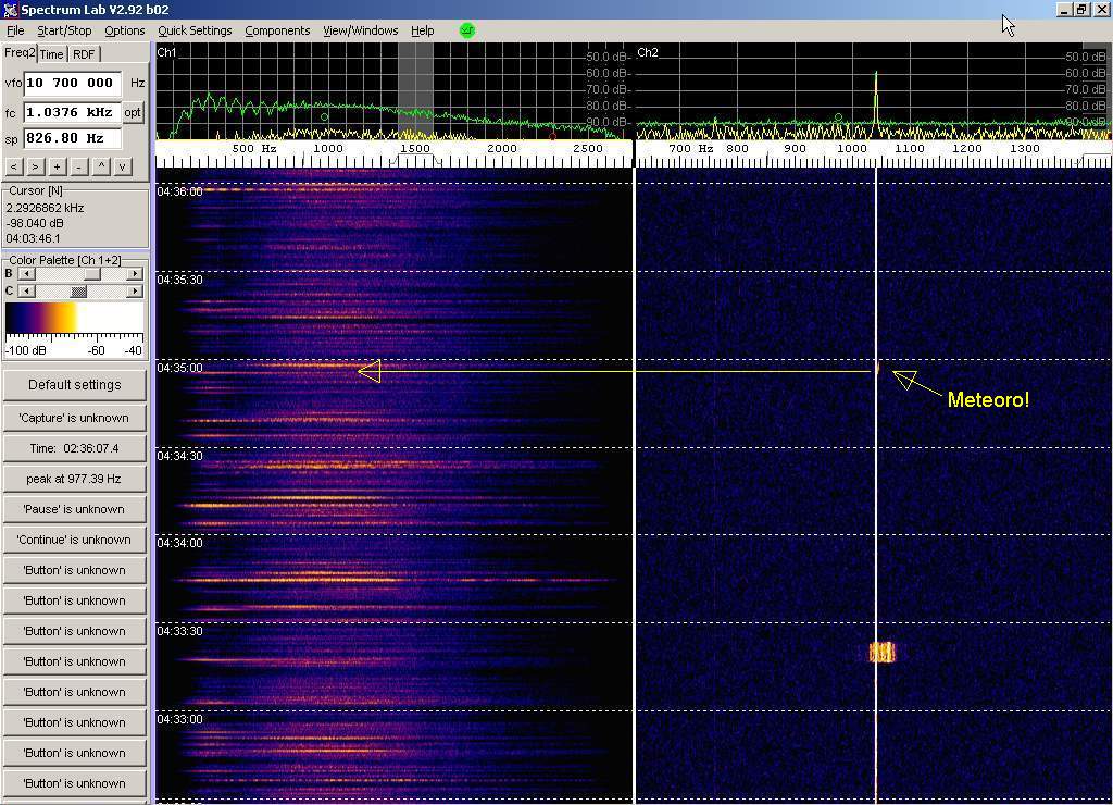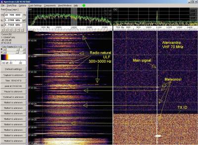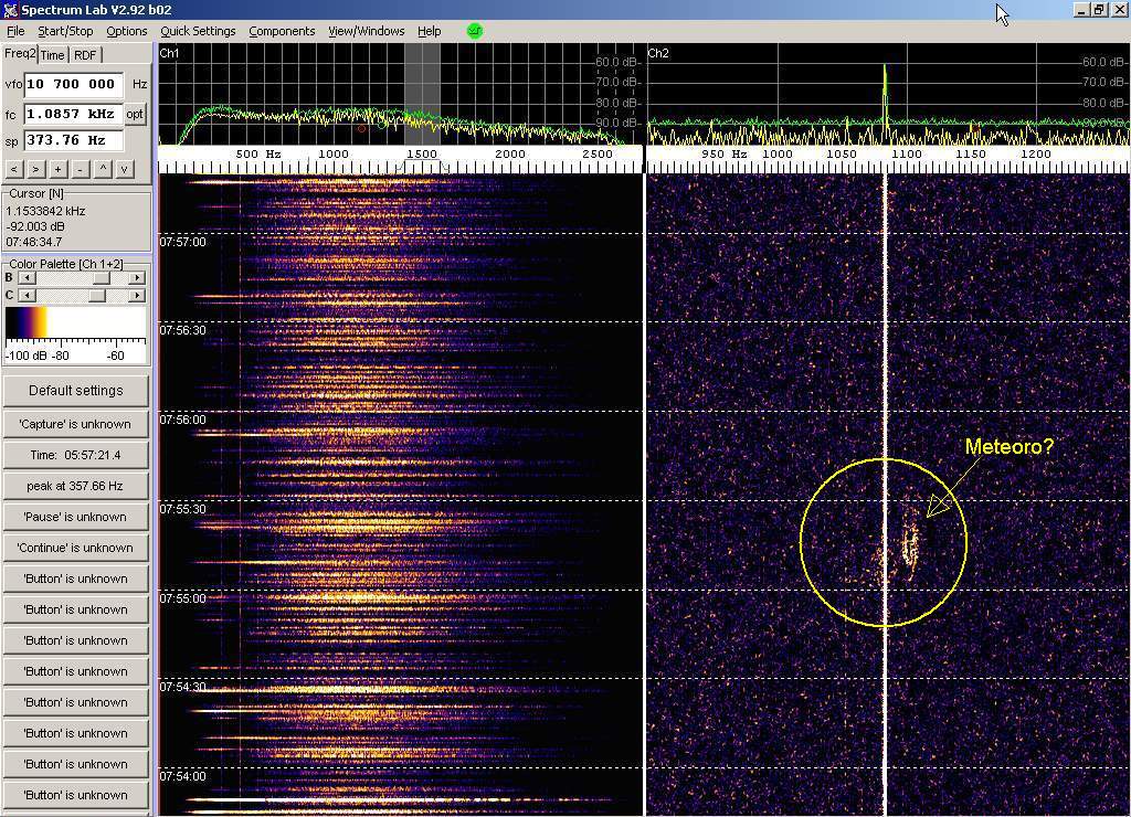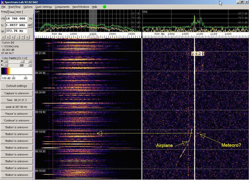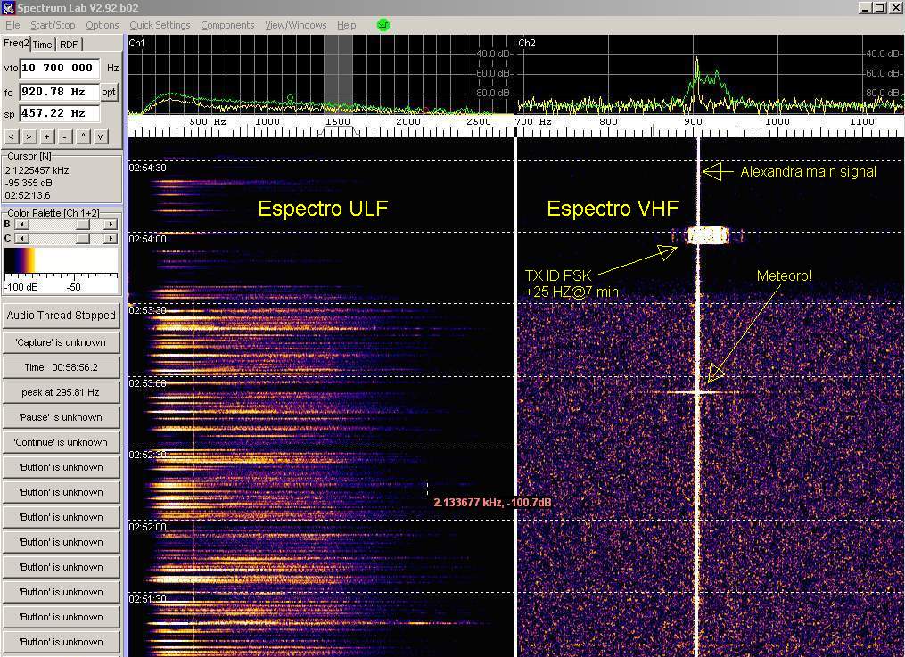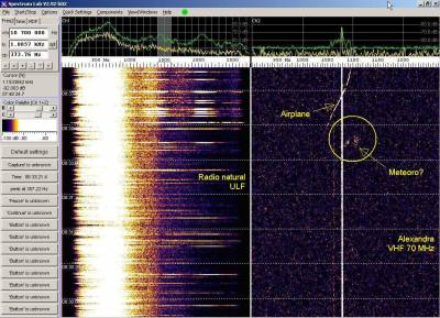 Apenas unos instantes despues de recibir la trama ID de Alexandra (canal derecho) aparece una detección clara de un meteoro (imagen superior).