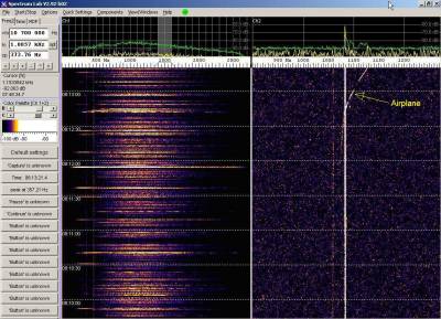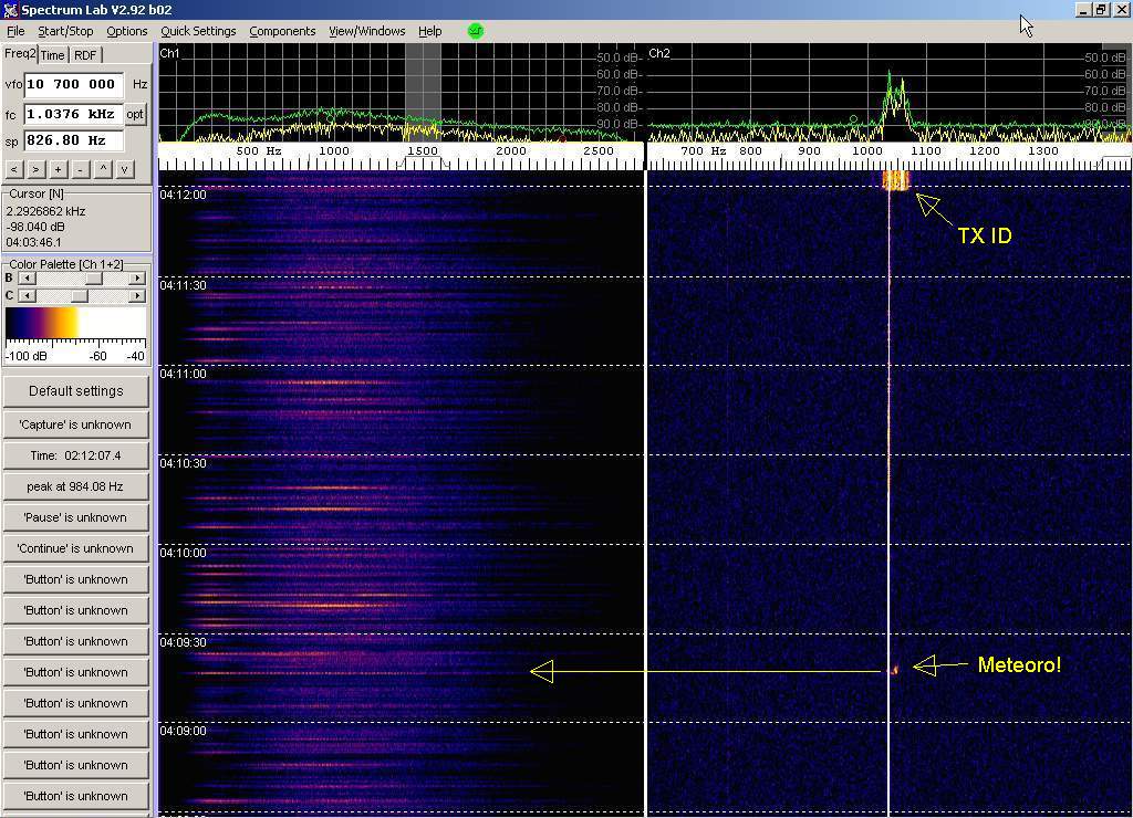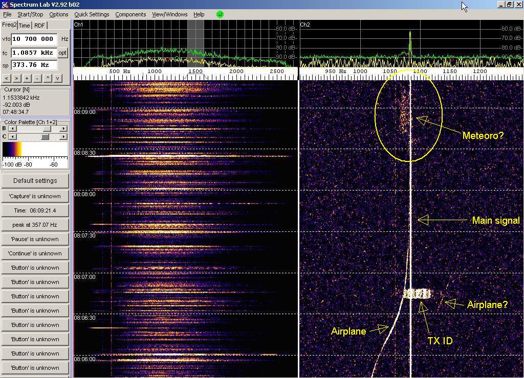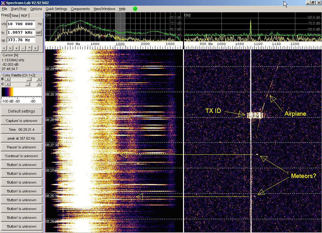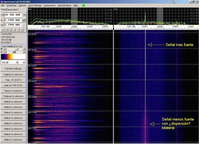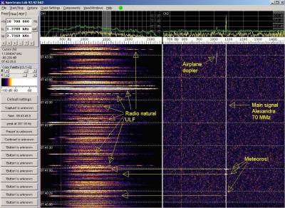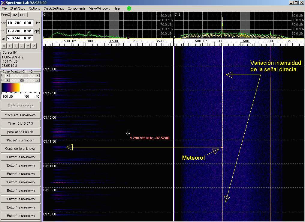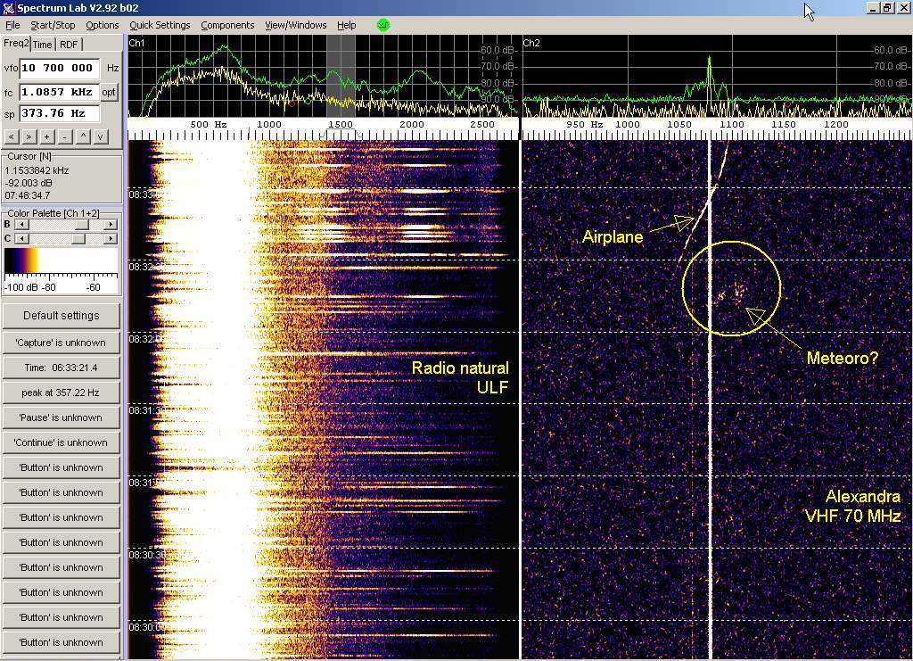 Apenas unos instantes despues de recibir la trama ID de Alexandra (canal derecho) aparece una detección clara de un meteoro (imagen superior).