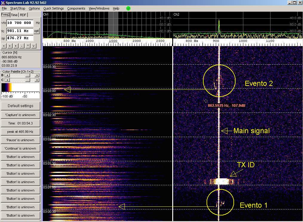 En la anterior entrada del blog subimos una relación de capturas realizadas con el radiotelescopio portable en Manzaneda. A continuación vamos a comentar los eventos mas destacables, asi como las posibles coincidencias de detección ultraespectral: