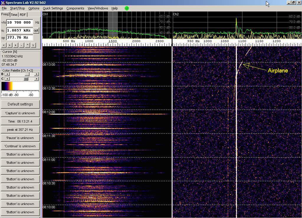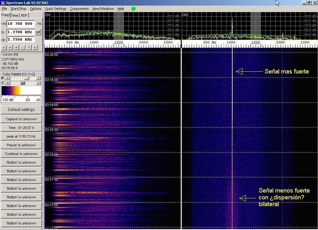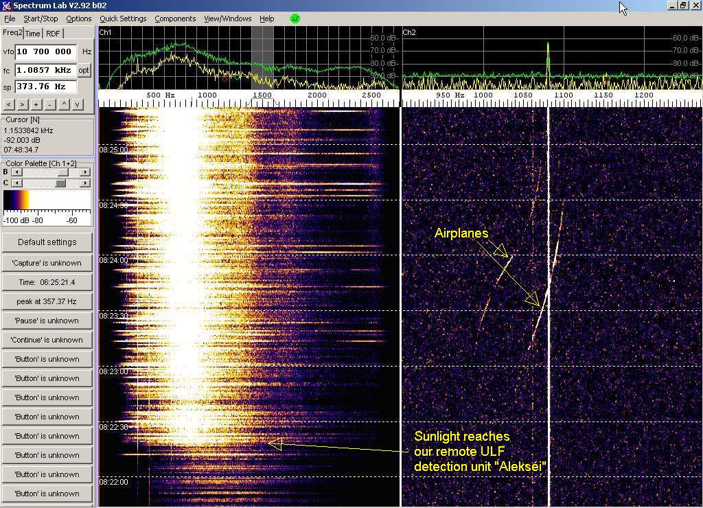 El canal izquierdo registra la actividad radioeléctrica en el espectro de frecuencias de ULF, desde 300 hasta 3000 Hz, muy rico en emisiones de radio de origen natural.