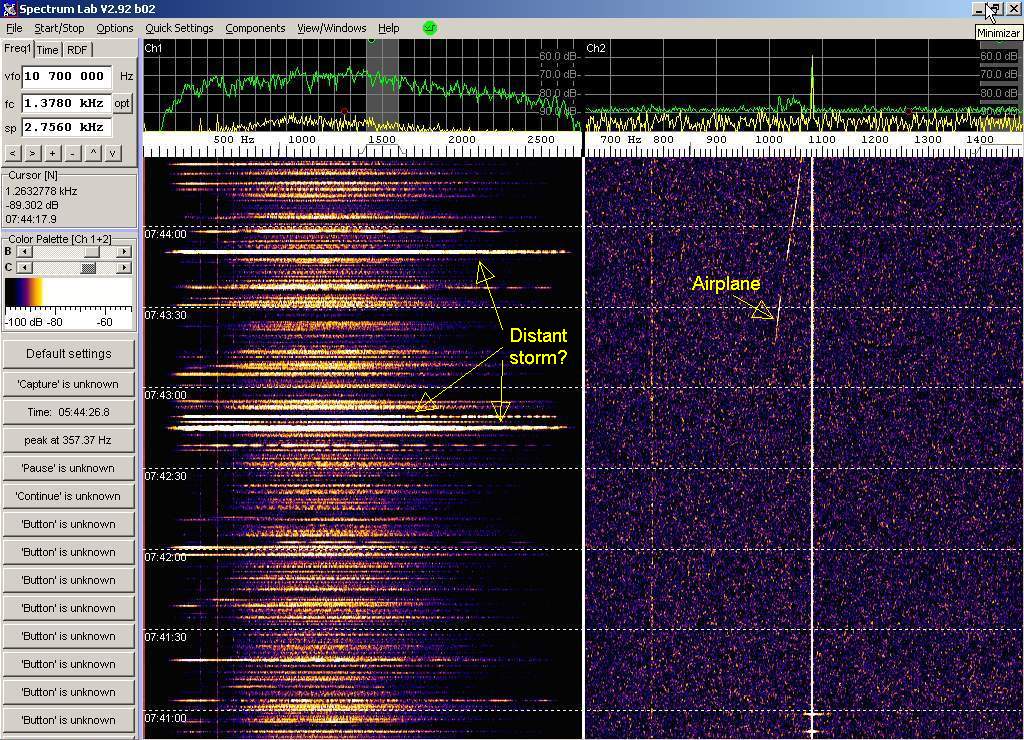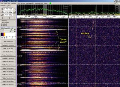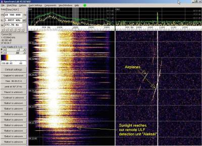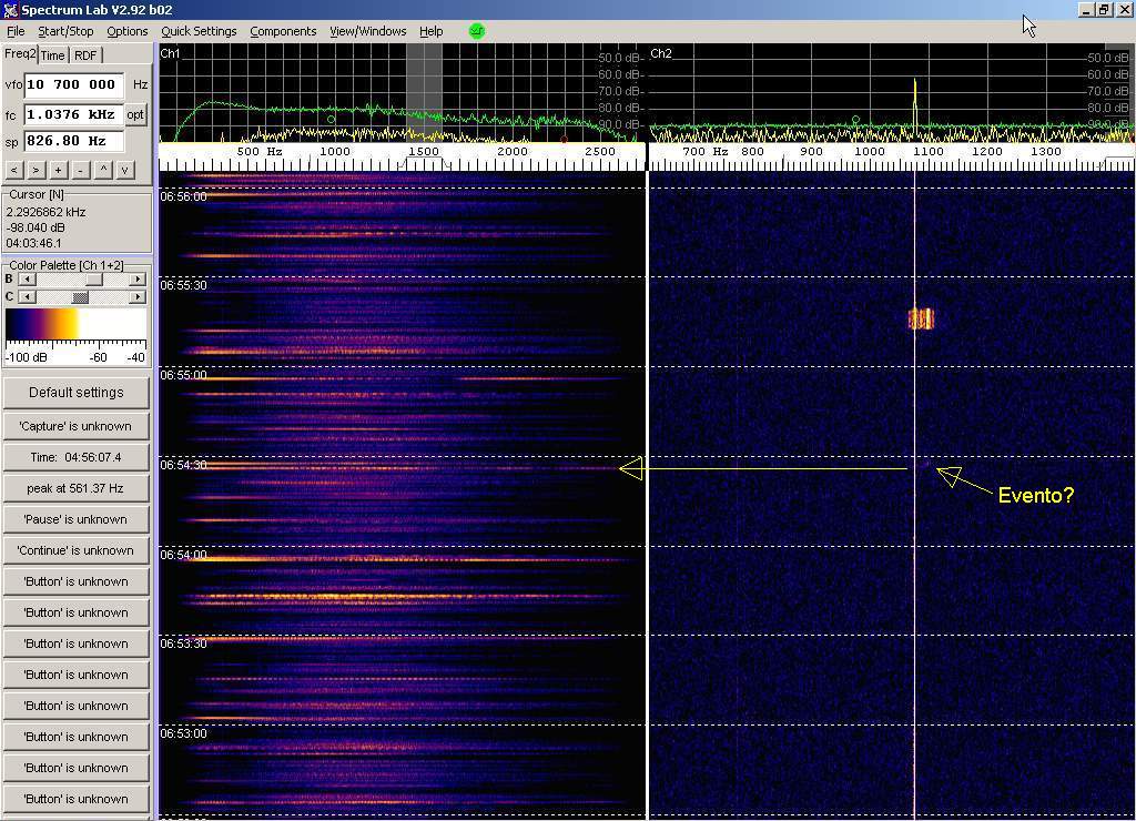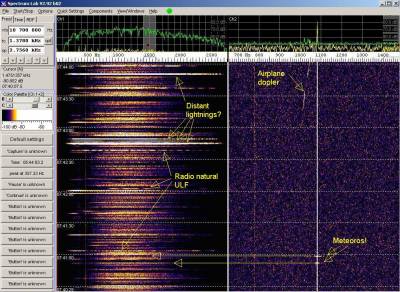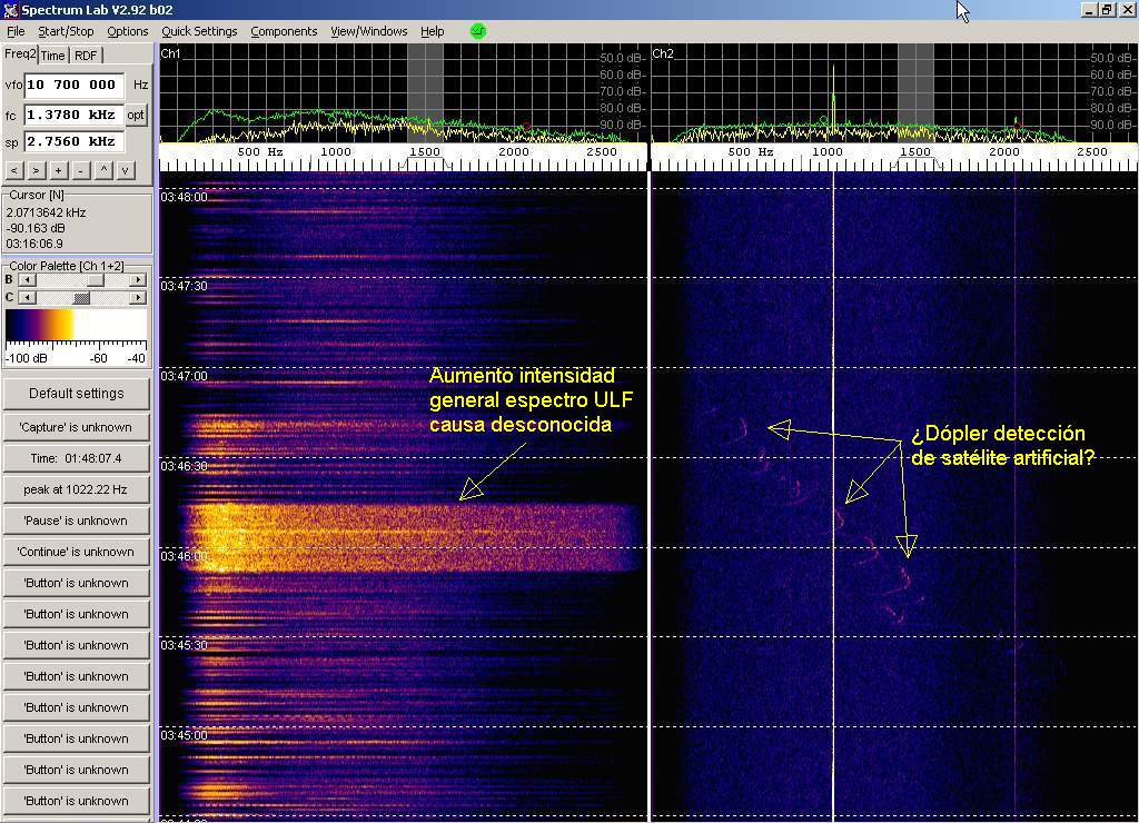 En el canal izquierdo (ULF), se aprecian unos registro de señal muy intensos, que abarcan prácticamente todas las frecuencias del espectro. Probablemente sean debidas a descargas de rayos lejanos.