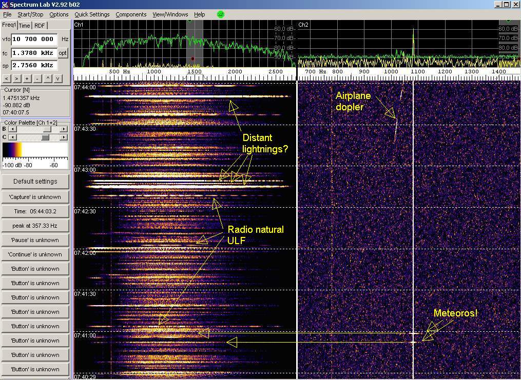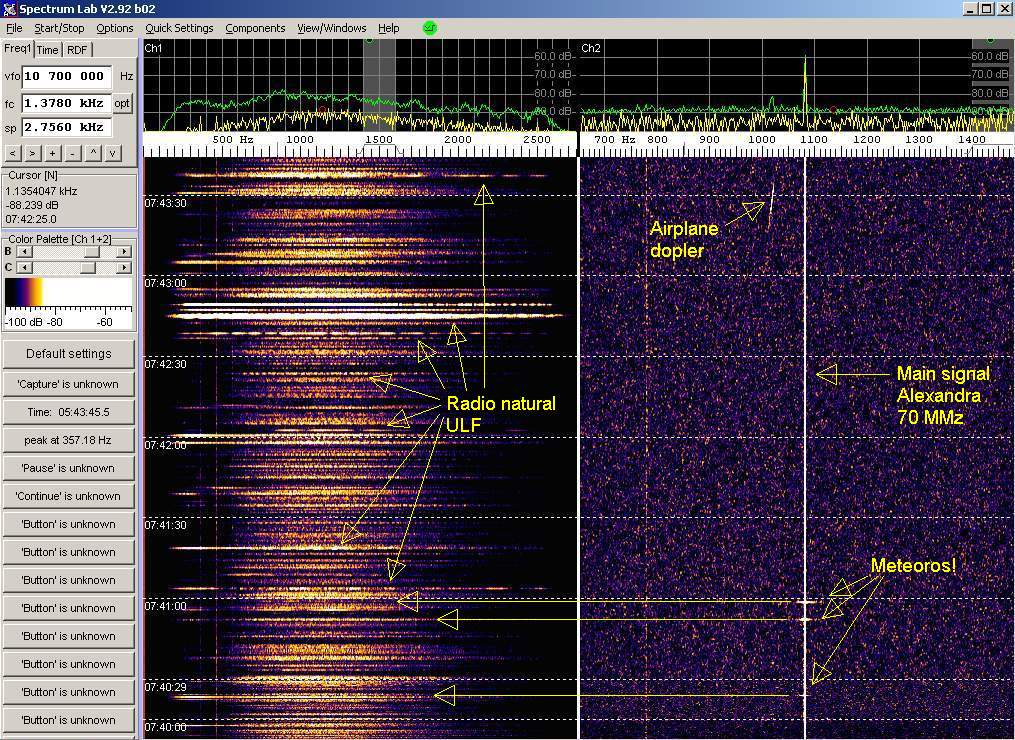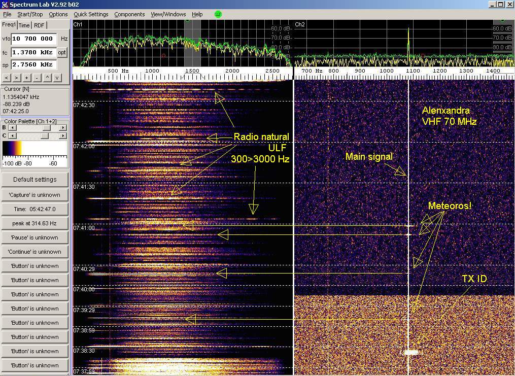 Buscamos en el espectro de ULF (canal izquierdo) una posible coincidencia de eventos. (flechas amarillas). En el espectro de VHF (canal derecho) apreciamos dos tipos de detecciones meteóricas: trazos dópler definidos y nubes de puntos difusas.