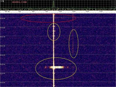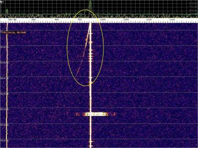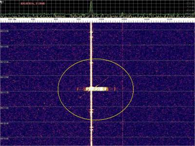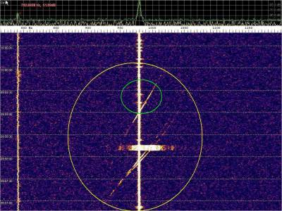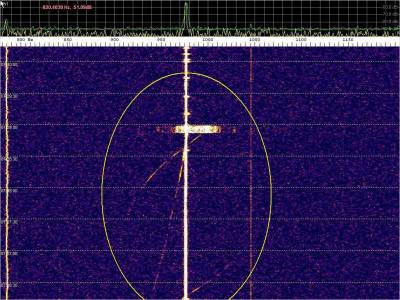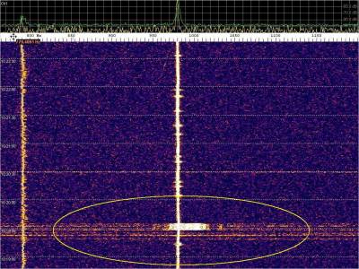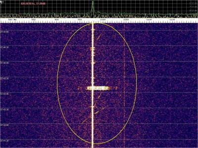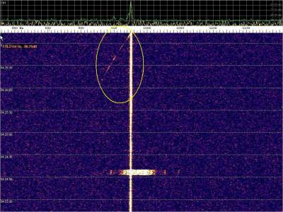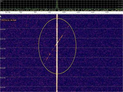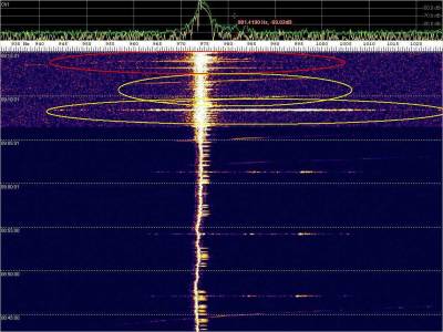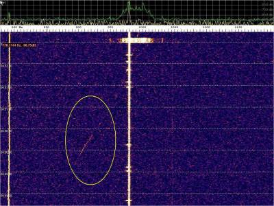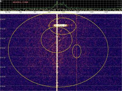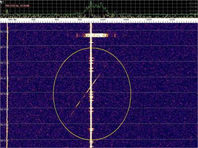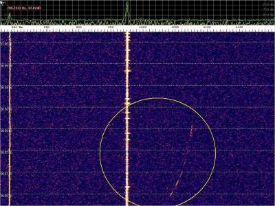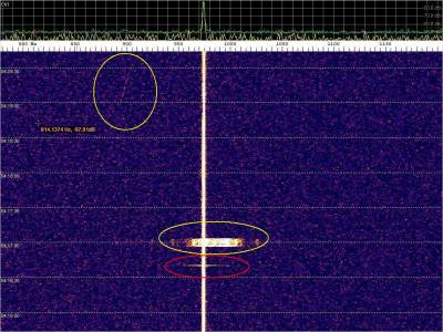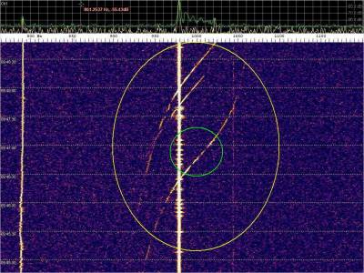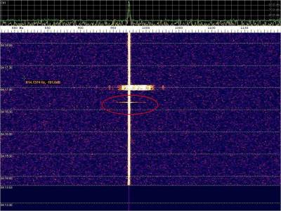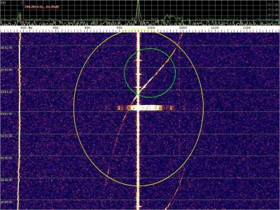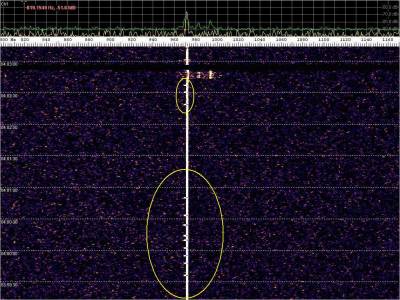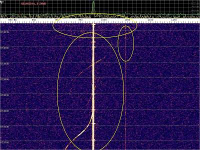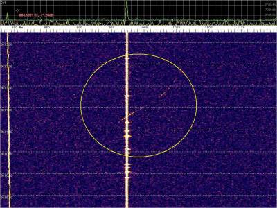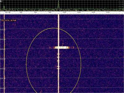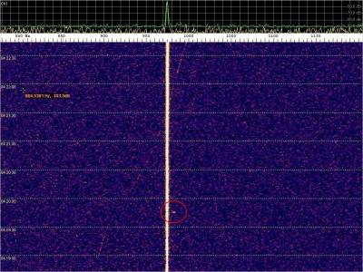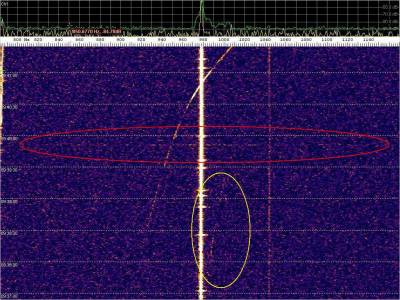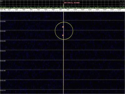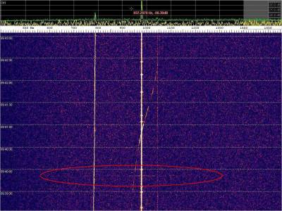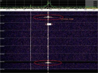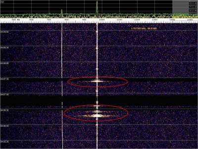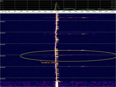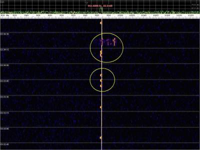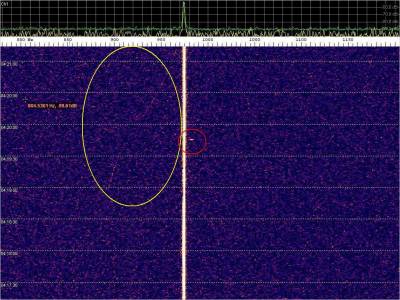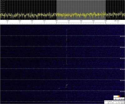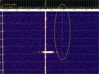 La detección anterior aparece en la parte inferior del waterfall. Mas arriba, después de la trama ID de Alexandra, aparece una nueva detección. Atención a las diferencias entres las diferentes señales (señal principal, burst misteriosos y trama ID).