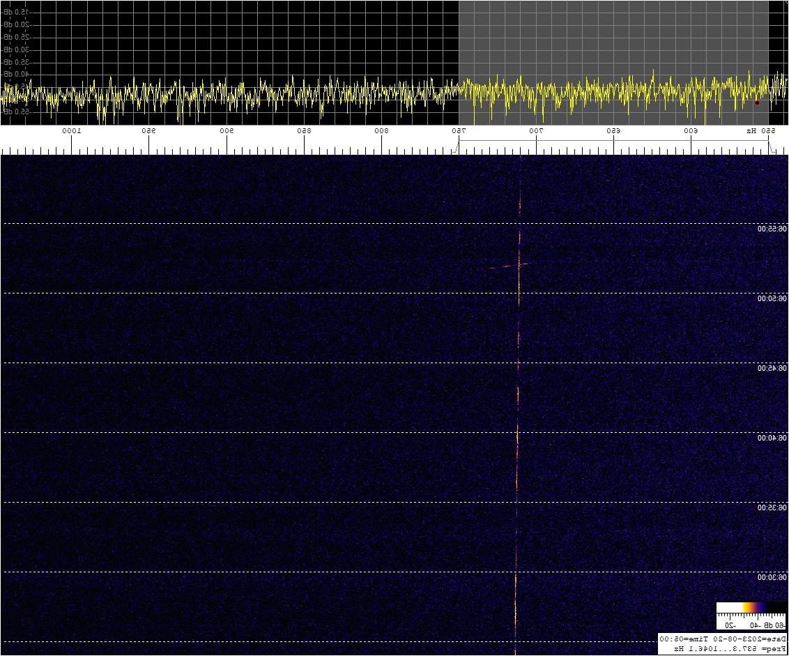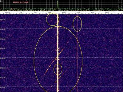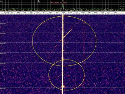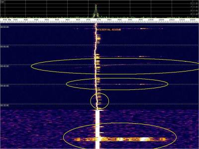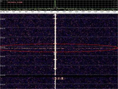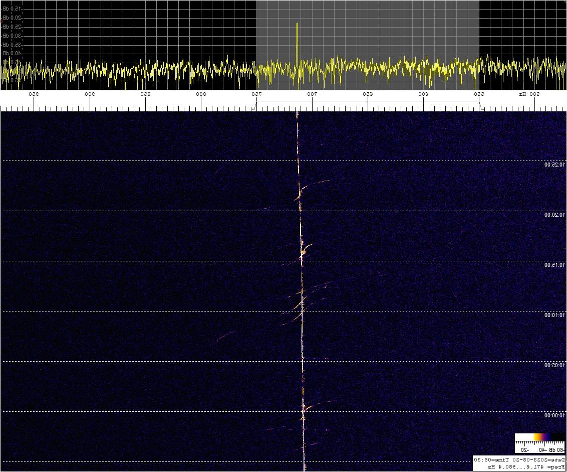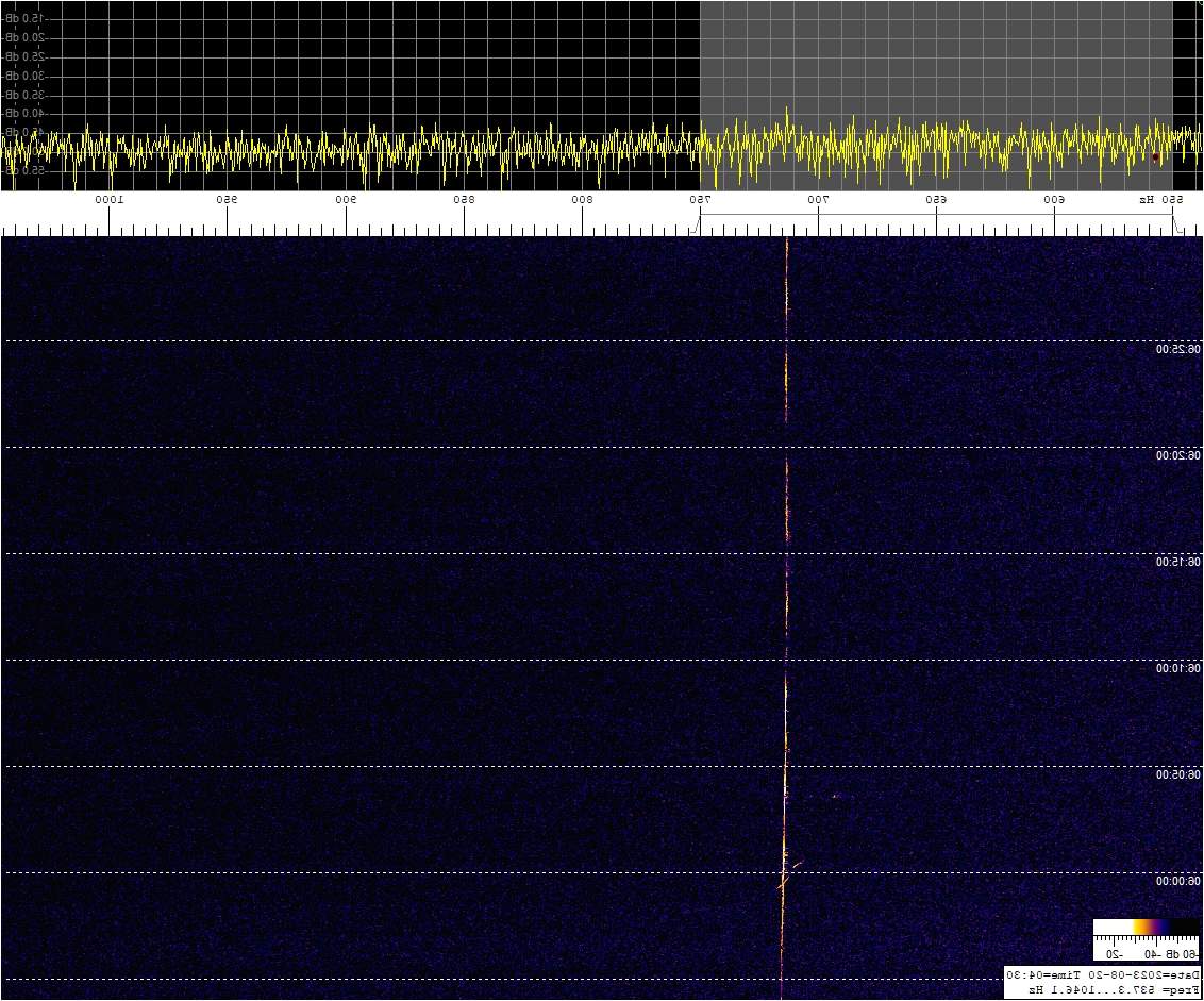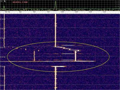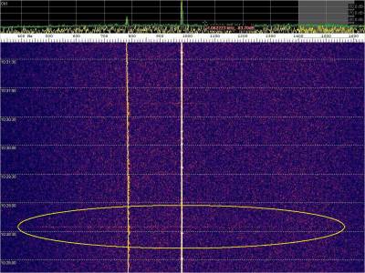 La detección anterior aparece en la parte inferior del waterfall. Mas arriba, después de la trama ID de Alexandra, aparece una nueva detección. Atención a las diferencias entres las diferentes señales (señal principal, burst misteriosos y trama ID).