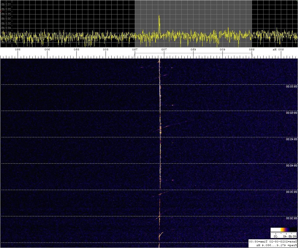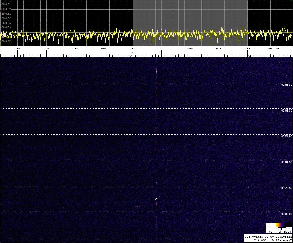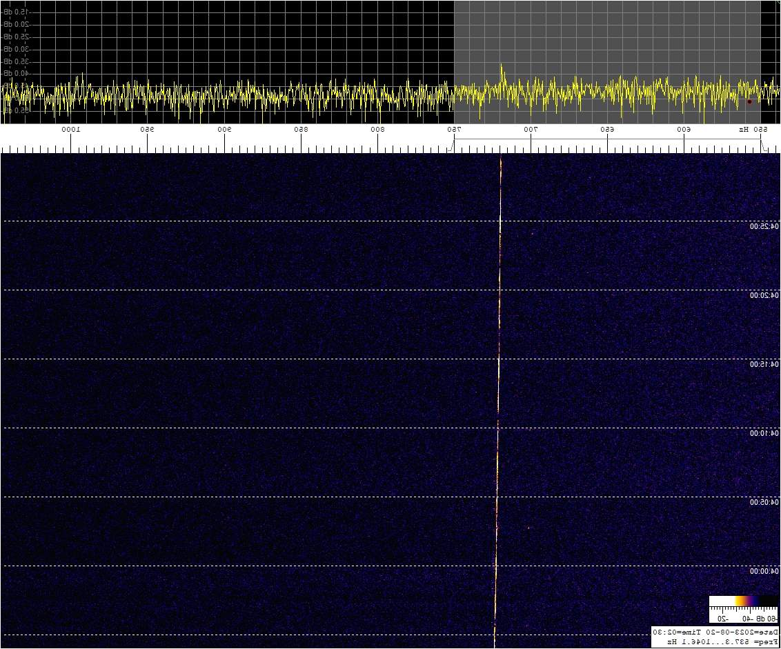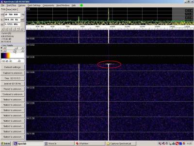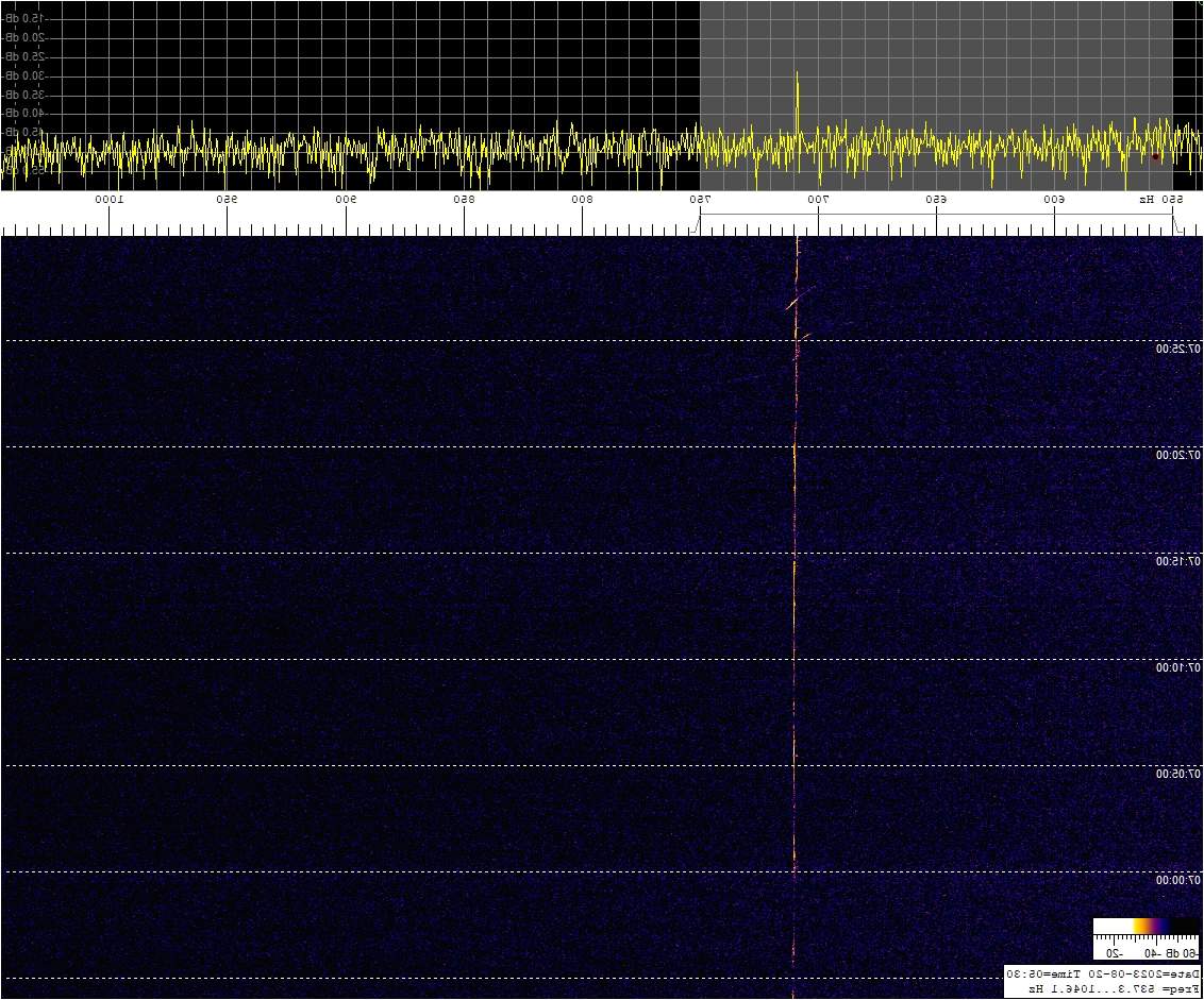 La detección anterior aparece en la parte inferior del waterfall. Mas arriba, después de la trama ID de Alexandra, aparece una nueva detección. Atención a las diferencias entres las diferentes señales (señal principal, burst misteriosos y trama ID).