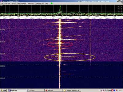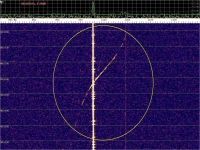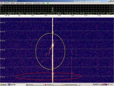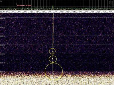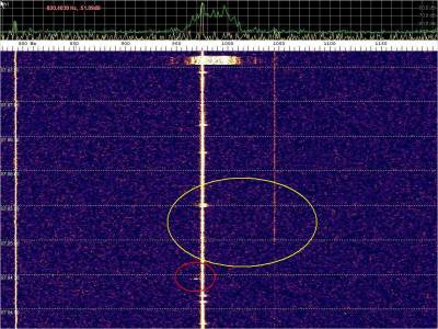 Resaltamos en color rojo las probables detecciones de meteoros. En la captura un evento muy rápido que ocupa toda la pantalla. Puede parecer un extenso, pero si observamos la escala veremos que apenas ocupa un ancho de banda de 300 Hz. La escala de frecuencias está muy aumentada para examinar con mas detalle los burst misteriosos.