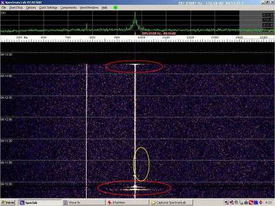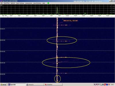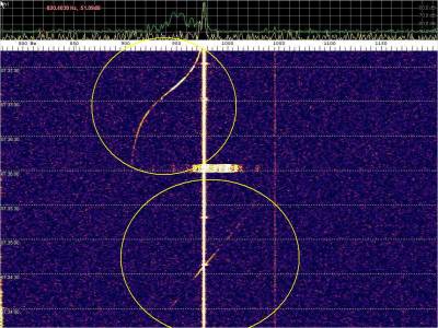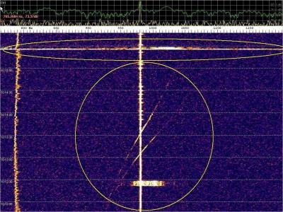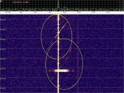 Dos probables detecciones, Atención a la diferencia del trazo , en anchura y duración, sobre los burst misteriosos. a la derecha el eco contínuo aparece de repente con buena intensidad.