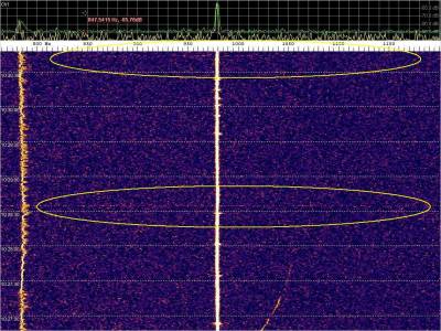 Comenzamos la serie de capturas orientando el dipolo de punta al transmisor, es decir atenuando todo lo posible la señal principal. Hasta que ya no resulta audible en el altavoz del receptor. Aunque si se aprecia claramente en el waterfall.