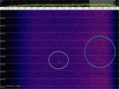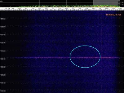 Primera captura, aparece un doppler de avión, un poco desplazado en frecuencia a la derecha. Ajustamos la sintonía del receptor para centrar la señal sobre los 650-700 Hz.