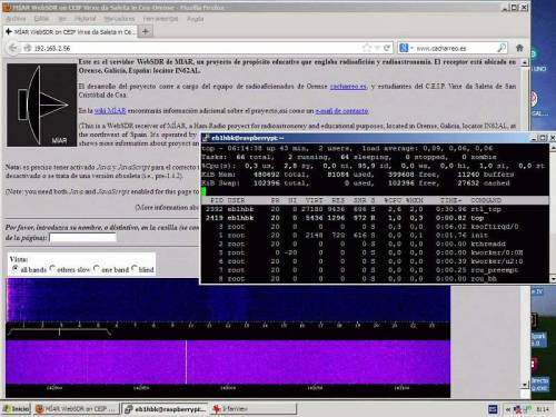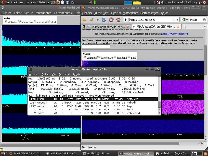 En la imagen superior observamos la captura de pantalla desde un computador cliente, conectado vía WIFI a la LAN del servidor WebSDR. En el computador cliente se están ejecutando a la vez dos navegadores de internet (Firefox y Epiphany), así como también varias sesiones SSH contra el servidor para monitorizar el funcionamiento del sistema.