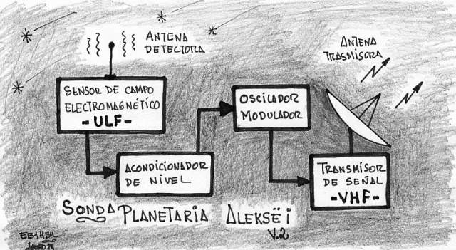 Todas las detecciones (ULF) realizadas por Aleksëi son retransmitidas vía radio (VHF) a la estación receptora del radiotelescopio portátil, como se aprecia en la siguiente lámina: