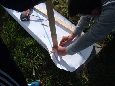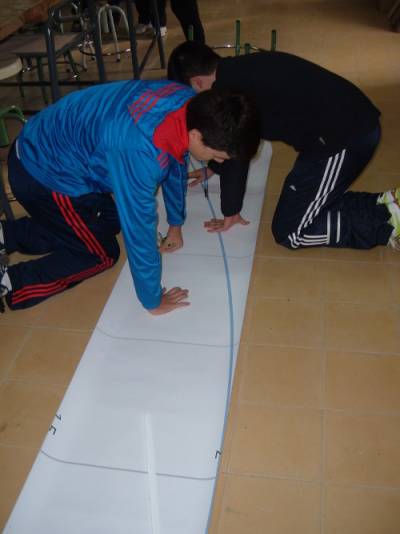 Hemos estado preparando los materiales para la construcción del reflector curvo. Primero, marcamos en la parábola donde irían los listones que la sujetarán.