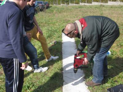 Hemos tenido que perforar la base de hormigón, para introducir los tacos y tornillos a los que irán sujetas las escuadras y con ellas ,los listones.