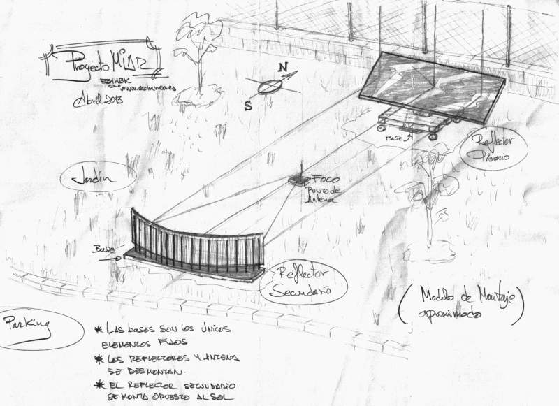 Esta función puede ir incorporándose al MÍAR de manera gradual. En un primera fase podemos implementar el sistema de movimiento del reflector para ajustarlo manualmente; a continuación podemos motorizar los actuadores y en una tercera etapa implementar el seguimiento“inteligente”. Esta secuencia puede aplicarse a un o dos ejes de movimiento: acimut y elevación. (…)