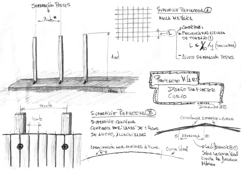 Sobre la misma base y aprovechando los mismos postes de soporte que determinan la curva principal del reflector curvado, podemos plantearnos diferentes perfiles para obtener diferentes modos de trabajo del reflector. Primero un plano general y luego veremos cada posibilidad por separado: