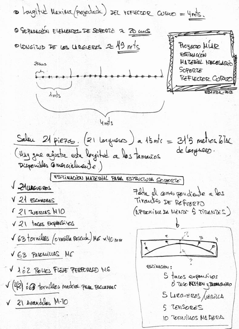 Esta es una estimación aproximada del material necesario para componer el soporte del reflector. Como sobre la plataforma podemos trazar el perfil de diferentes curvas -por ejemplo circular y parabólica- el número de tacos expansivos y tornillos de protección se incrementará en la cantidad adecuada para completar completar el perfil de cada curva adicional.