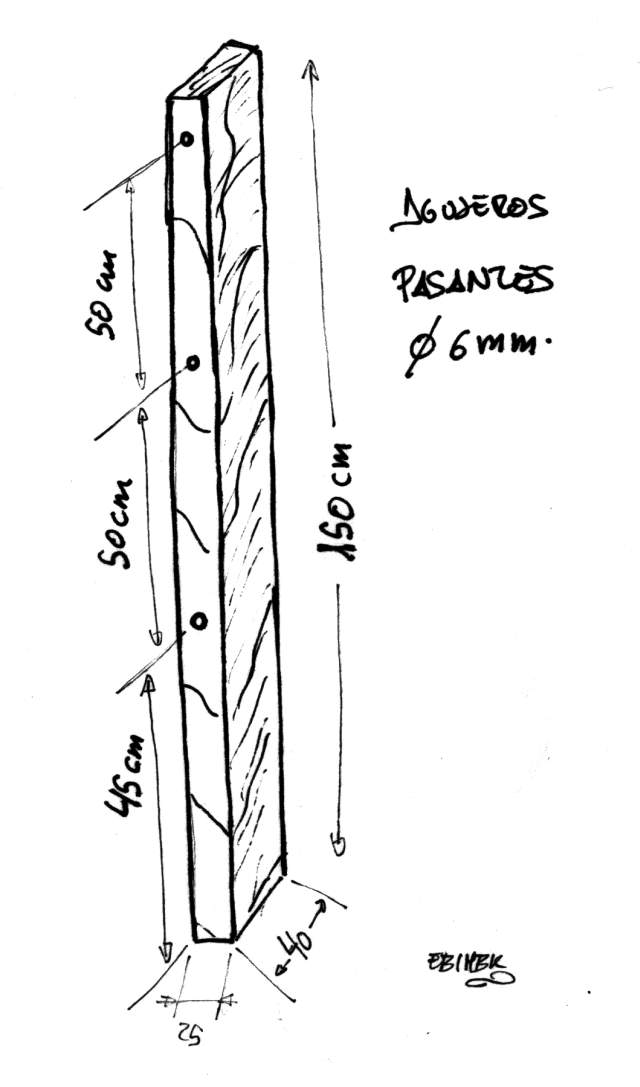 Para facilitar el transporte del europalet hasta su plataforma, se equipará éste con cuatro sencillas asas de cuerda, practicando para ello unos agujeros en los listones laterales, tal y como se muestra en el siguiente dibujo:
