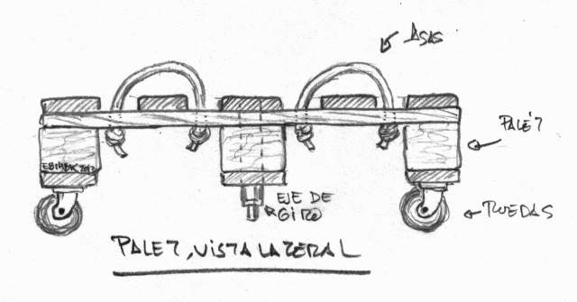Esta estructura móvil se realizará sobre un europalet dotado de ruedas. La plataforma cuadrada, donde se ubicará en reflector móvil está dimensionada precisamente para permitir el giro del europalet alrededor de un eje central.