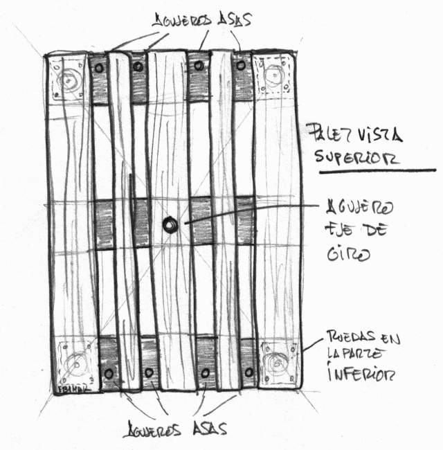 Como mencionábamos antes, vamos a emplear como elemento soporte dos palets normalizados de madera. El palet inferior es un europalet normalizado, que ofrece mayor peso y solidez. Acoplado a éste mediante bisagras usamos un palet estándar de 1,20×0,80 mts, que es mas ligero. Los dos palets se unen mediante tres bisagras, lo que permite que el palet superior pueda cerrase o abrirse como la tapa de un libro con respecto al inferior. Veremos mejor la idea en el siguiente boceto: