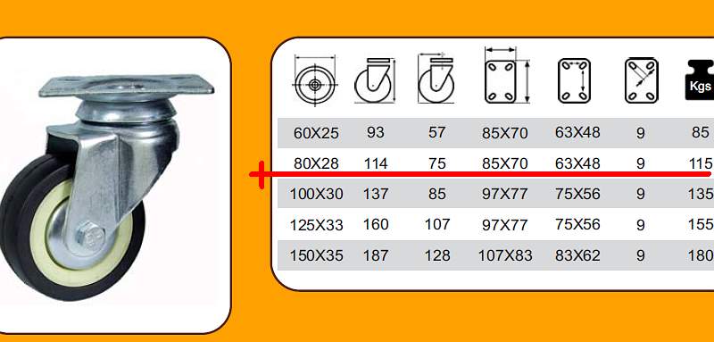 Estas son las ruedas que hemos elegido para soportar toda la estructura móvil del reflector plano, son bastante robustas y con la rueda de goma para amortiguar las imperfecciones de la superficie de rodadura.