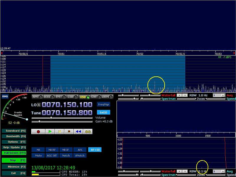Aumentamos al máximo los diales de sensibilidad del recptor y la señal aparece entonces claramente con su “huella” característica.