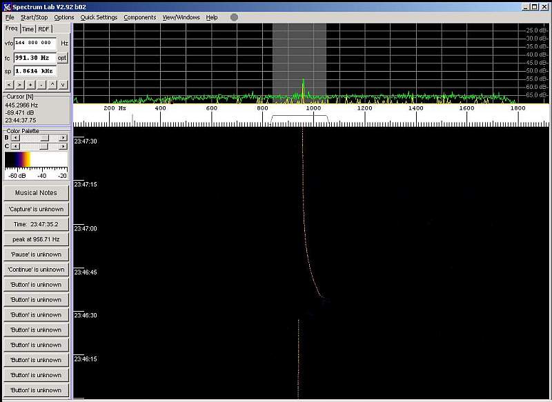 En el SpectrumLab la señal se muestra clara e inconfundible, con muy nivel sobre el rudio de fondo. El equipo de recpción fué el mismo que en la ocasión anterior, pero la importancia de una ubicación límipa de ruido electromagnético resulta evidente.