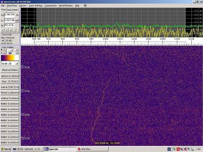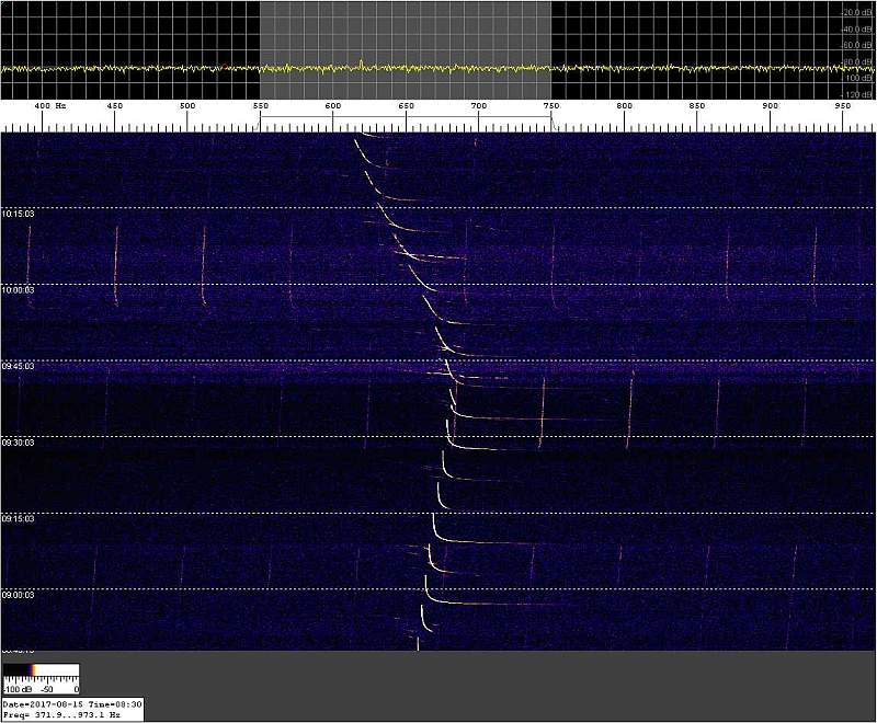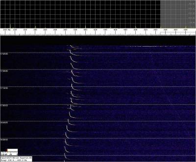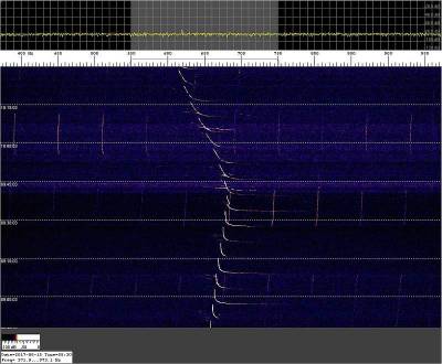 Estas capturas aparecen como “comprimidas” por que corresponden a períodos prolongados de escucha. Fijémonos en la siguiente captura, justo en la parte superior del waterfall, hacia la derecha, una brillante línea blanca horizontal. ¿Interferencia? ¿doppler de un objeto muy veloz?