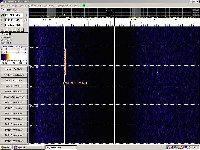 En el canal izquierdo, sobre los 925 Hz, apreciamos una linea blanca vertical. Es la señal generada por ALEXANDRA. La estabilidad es muy buena y se mantiene desde la ultima mejora en el oscilador del transmisor.
