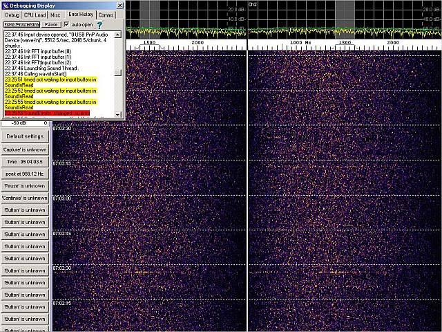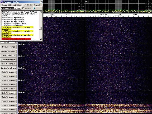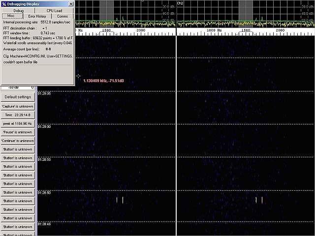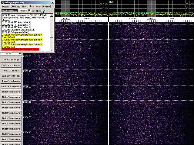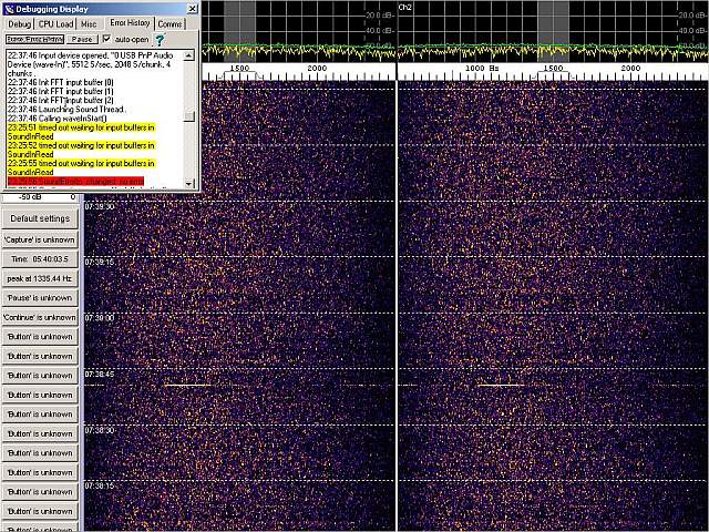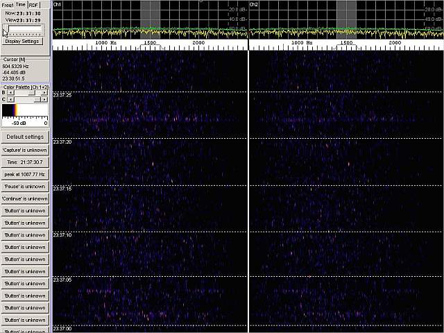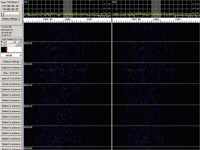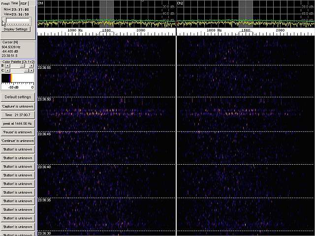 En esta captura, en la parte inferior del waterfall, aparece una débil señal en ambo canales, con un doppler acusado, por eso es casi horizontal. Bueno, mas que una señal, parecen vestigios de la misma . se aprecia mejor en el canal izquierdo.