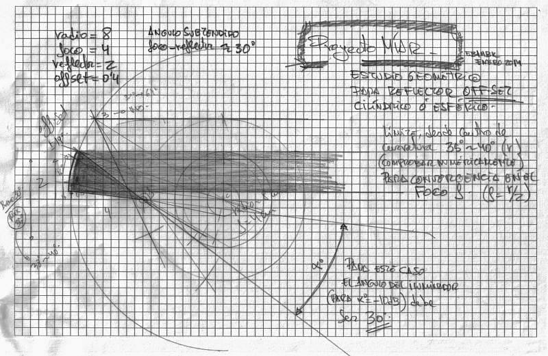 En el siguiente boceto se muestra el estudio geométrico correspondiente a un reflector offset de perfil circular, para estimar la viabilidad del sistema.