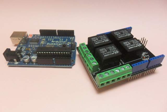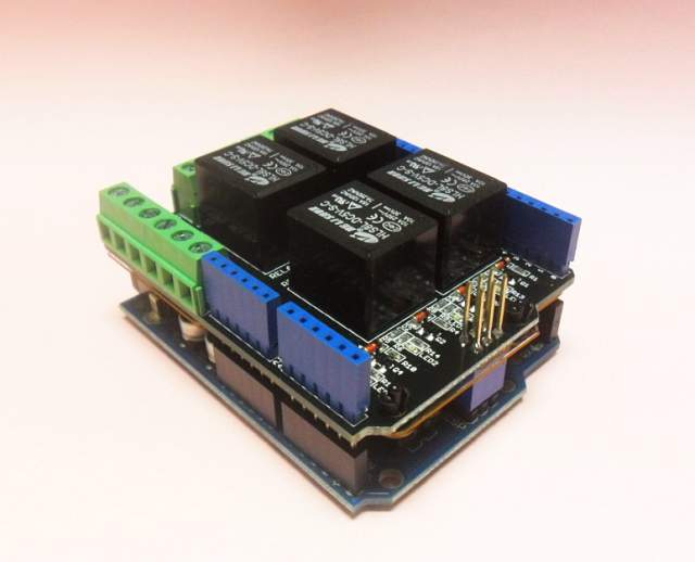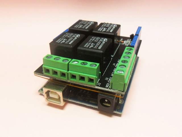 El trabajo de manejar los motores de seguimiento recaerá sobre un Arduino, empleando para ello la ayuda de un shield específico que incorpra cuatro relés. A continuación podemos ver unas fotos del Arduino y el shield de relés por separado, y un poco mas abajo ensamblados en condiciones de funcionamiento normal: