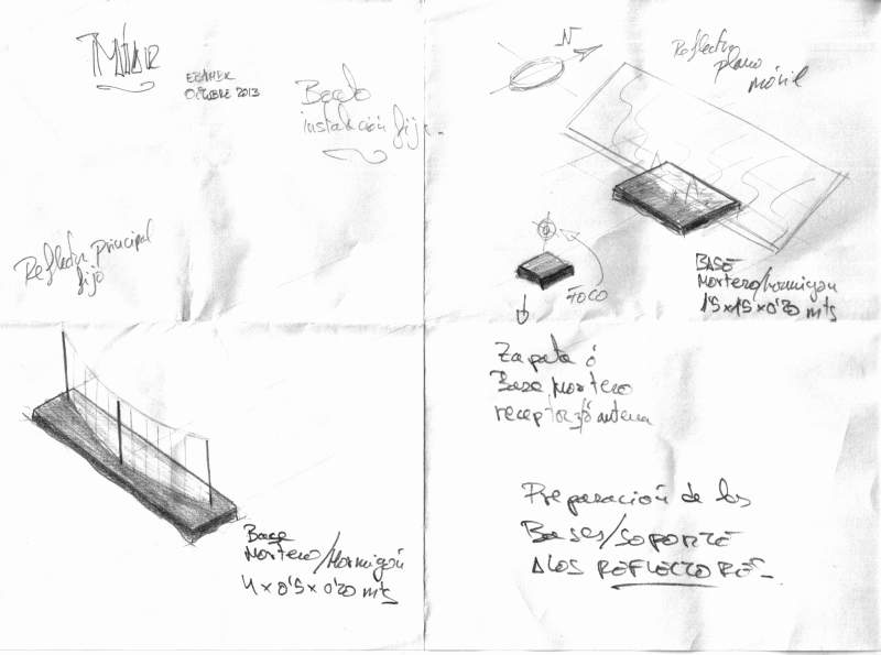Veamos unos bocetos, tanto de las plataformas de apoyo como del conjunto de reflectores. Estas son las bases o zapatas que servirán de apoyo a todo lo demás (pinchando sobre cada imagen podrás verla ampliada):