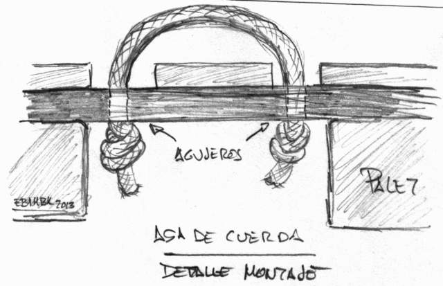 Para colocar unas asas (lo ideal son cuatro) podemos recurrir a unos simples retales de cuerda , como se muestra en el siguiente dibujo. Pasamos los cabos a traves de un agujero en el liston del palet y bloqueamos el asa haciendo un nudo en cada cabo.