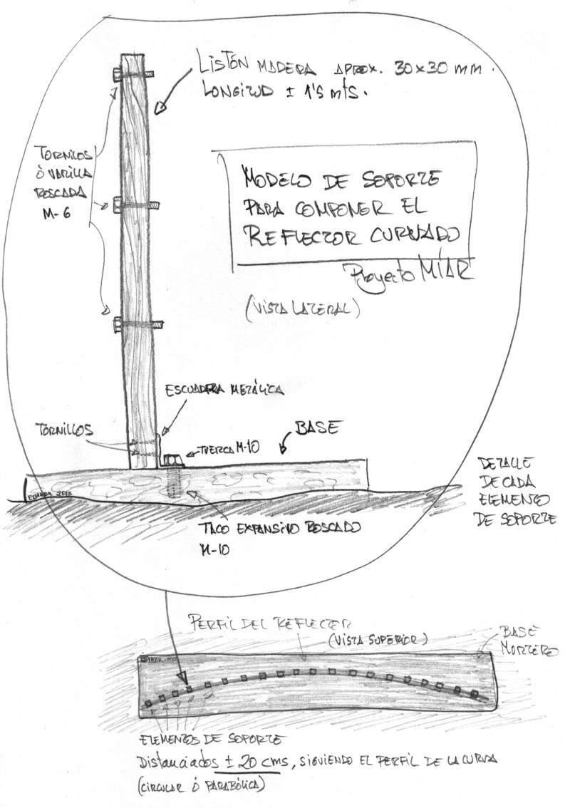 Sobre la misma base y aprovechando los mismos postes de soporte que determinan la curva principal del reflector curvado, podemos plantearnos diferentes perfiles para obtener diferentes modos de trabajo del reflector. Primero un plano general y luego veremos cada posibilidad por separado: