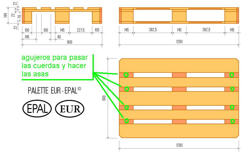 Para facilitar el transporte del europalet hasta su plataforma, se equipará éste con cuatro sencillas asas de cuerda, practicando para ello unos agujeros en los listones laterales, tal y como se muestra en el siguiente dibujo: