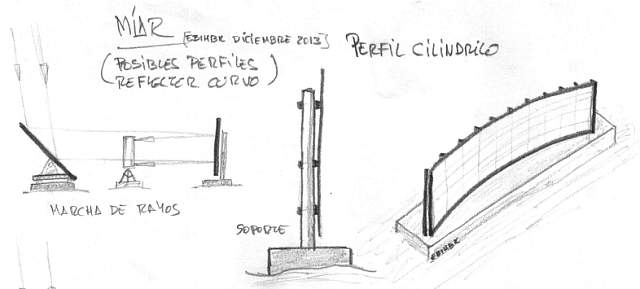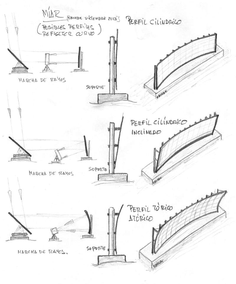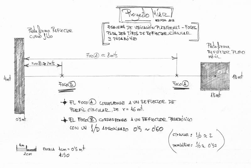 Sobre la plataforma rectangular es posible trazar diferentes curvas para el reflector. La estimación inicial fue trabajar con un reflector de perfil circular, con un radio de 16 metros y el foco ubicado a unos 8 metros del reflector. Es posible trazar círculos de menor radio, con lo cual el foco estaría mas próximo al reflector e incluso emplear otra forma de curva mas compleja, como una parábola.