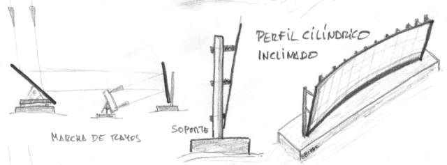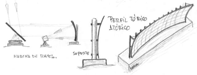 Veamos ahora un boceto con las dos posibilidades de elaboración de la superficie reflectora curvada. La misma estructura soporte nos permite emplear diferentes superficies reflectoras: láminas aluminizadas o rejilla metálica.